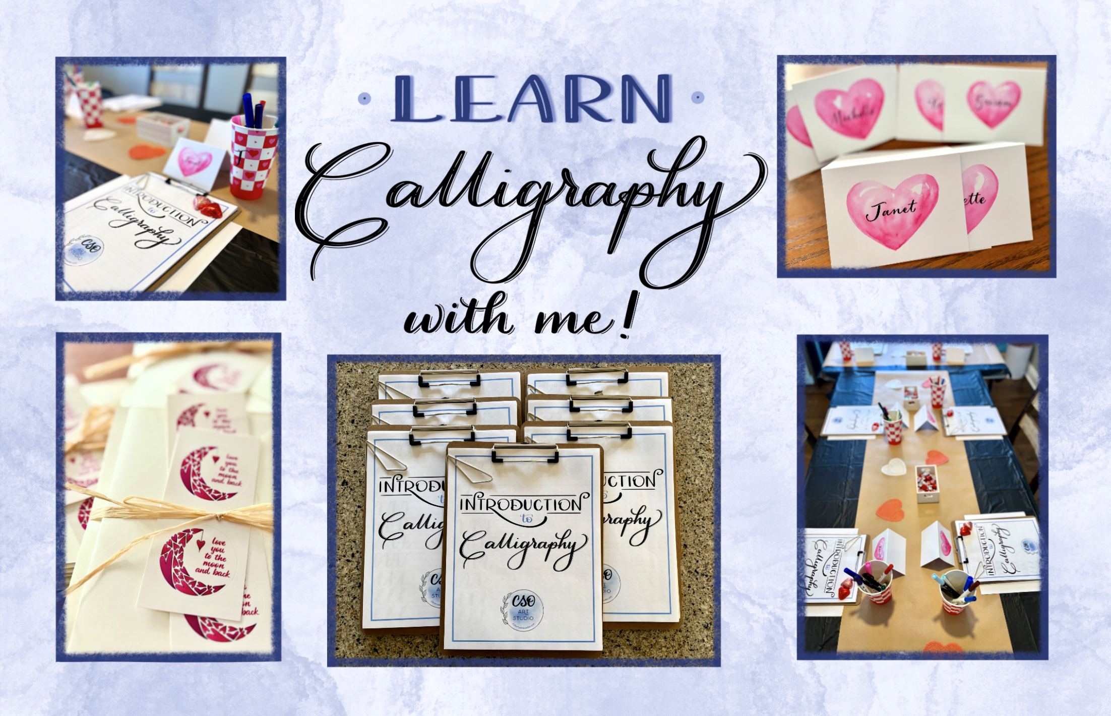 Included: A customized workbook filled with lettering guides and tracing sheets, a variety of calligraphy brush pens, personal instruction, and blank notecards and envelopes to create finished pieces. Classes can be customized for a holiday, birthday or special occasion.